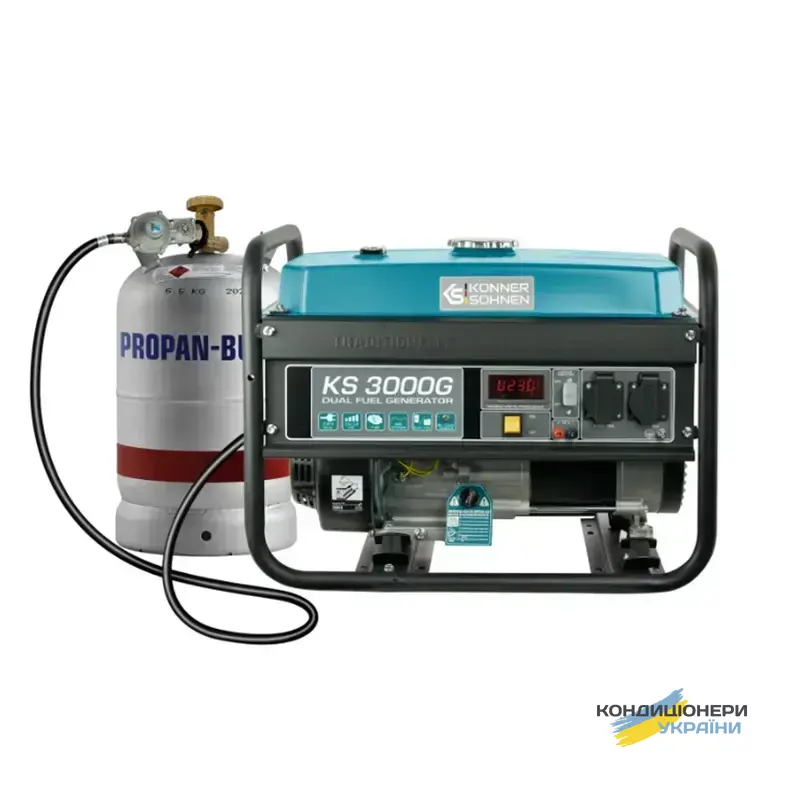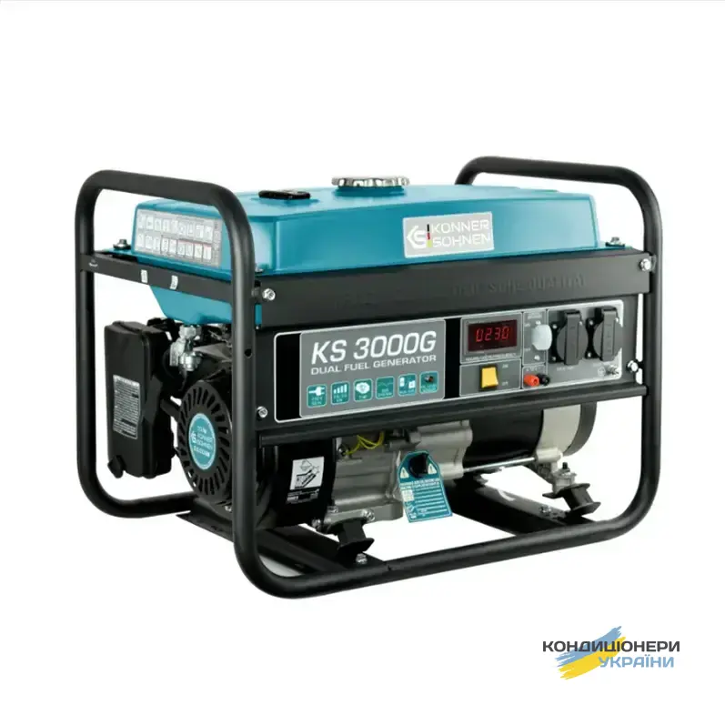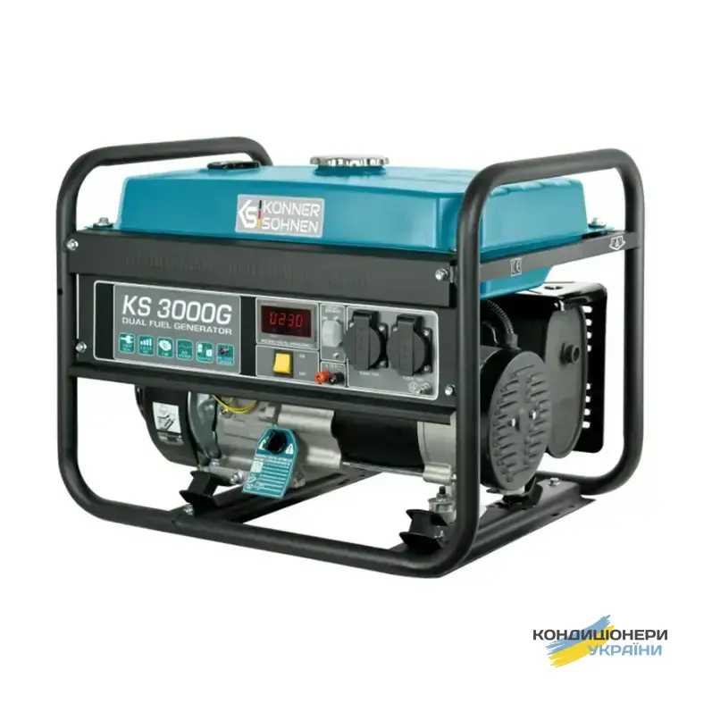 Газобензиновый генератор Konner&Sohnen KS 3000G (максимальная мощность 3 кВт, номинальная 2,6 кВт) работает не только на бензине, но и на газе. При этом, експлуатация на газу повышает моторесурс двигателя. Расход топлива: 1 литр в час бензина, 1,3 л в час газа, при 50% нагрузке. Данная Dual Fuel система позволяет пользователю самостоятельно выбирать тип топлива по своему желанию, экономить.