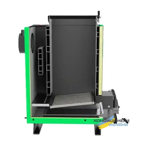 Котёл выполнен в виде двухкамерной вертикальной конструкции, где основной процесс горения происходит в нижней зоне топки, а верхние слои топлива постепенно подсушиваются. Такой принцип позволяет добиться равномерной теплоотдачи, удлинить время работы на одной загрузке и минимизировать потери тепла. Корпус и теплообменные элементы изготовлены из жаростойкой стали 5 мм толщиной, что гарантирует надежность и длительный срок службы котла.