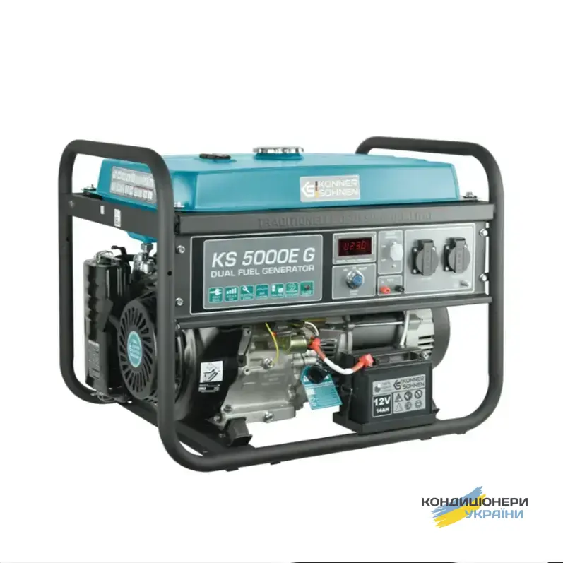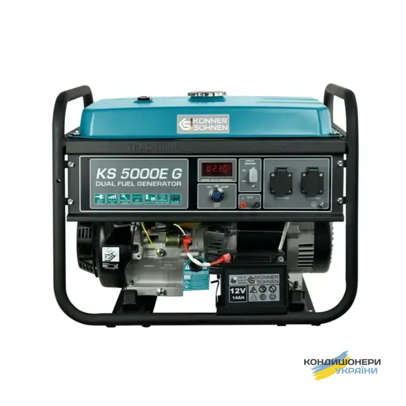 Газобензиновий генератор Konner&Sohnen KS 5000E G (максимальна потужність 4,5 кВт, номінальна 4 кВт) працює не лише на бензині, але й на газу. При цьому експлуатація на газу підвищує моторесурс двигуна та дозволяє працювати тихіше. Данна Dual Fuel система дозволяє користувачу самостійно вибирати тип палива по своєму бажанню та економити. Зберігати балони до речі теж набагато зручніше, ніж каністри.