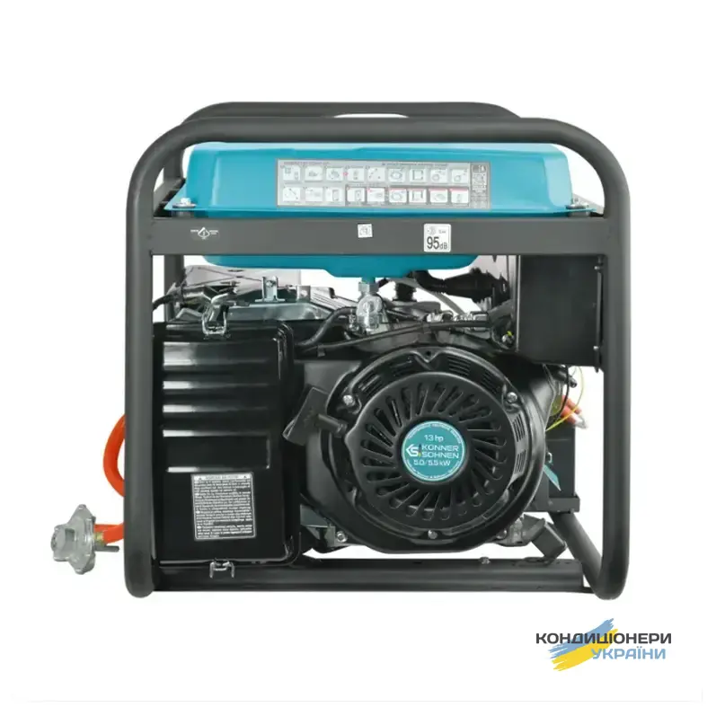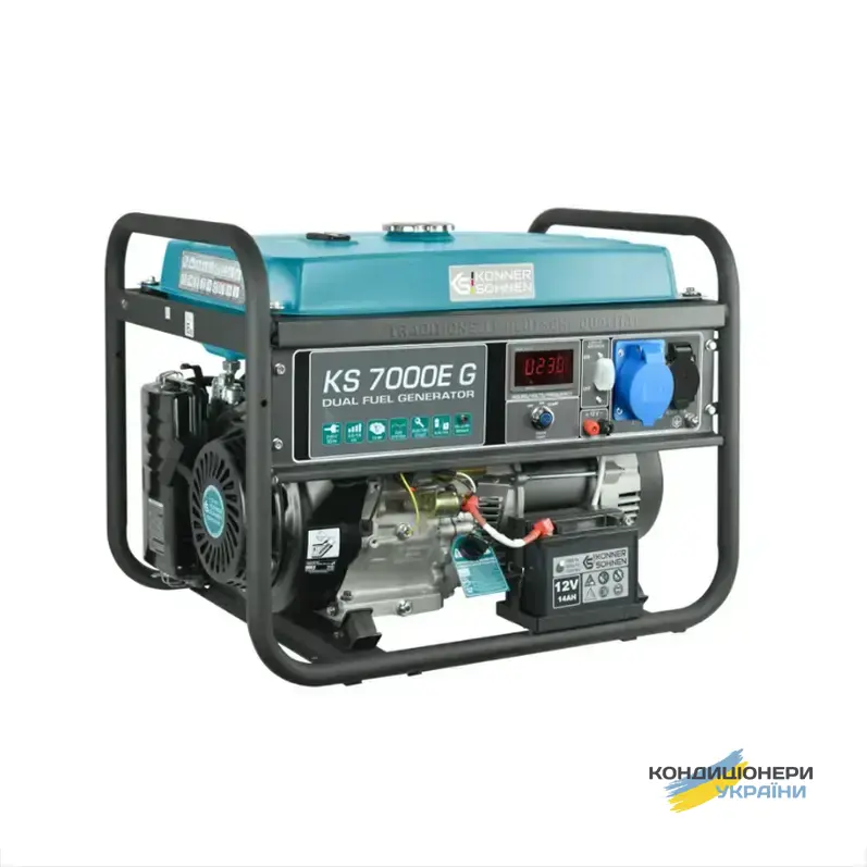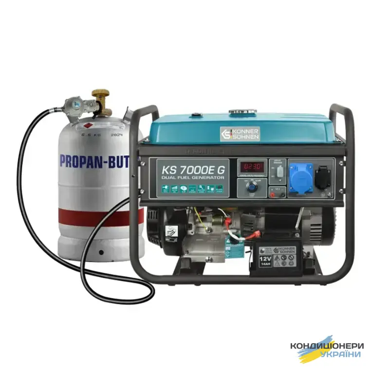 Газобензиновий генератор Konner&Sohnen KS 7000EG (максимальна потужність 5,5 кВт, номінальна 5 кВт) працює не лише на бензині, але й на газу. Витрата палива: 1,4 л в годину бензина, 1,6 л в годину газу при 50% навантаженні. Данна Dual Fuel система дозволяє користувачу самостійно вибирати тип палива по своєму бажанню та економити. Крім того, запуск генератора можна здійснити як ручним способом (смикнути за стартер), так і електро (завести ключем).