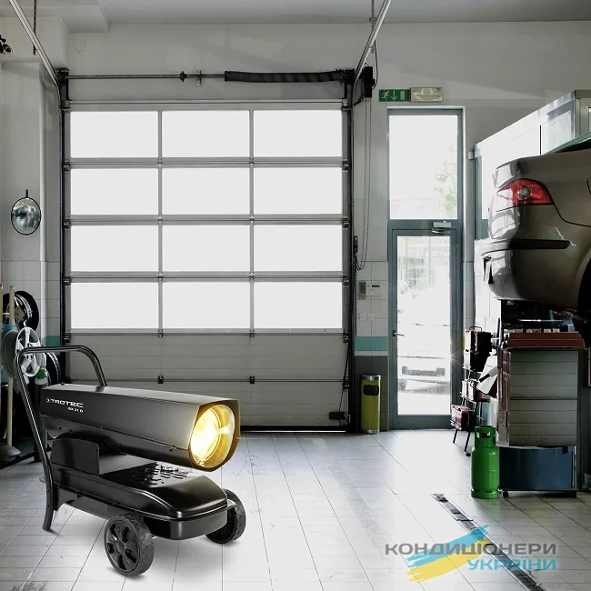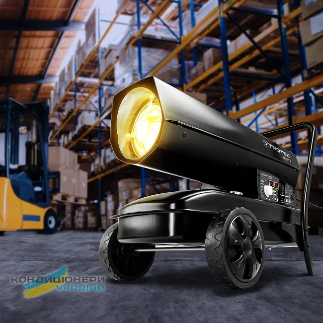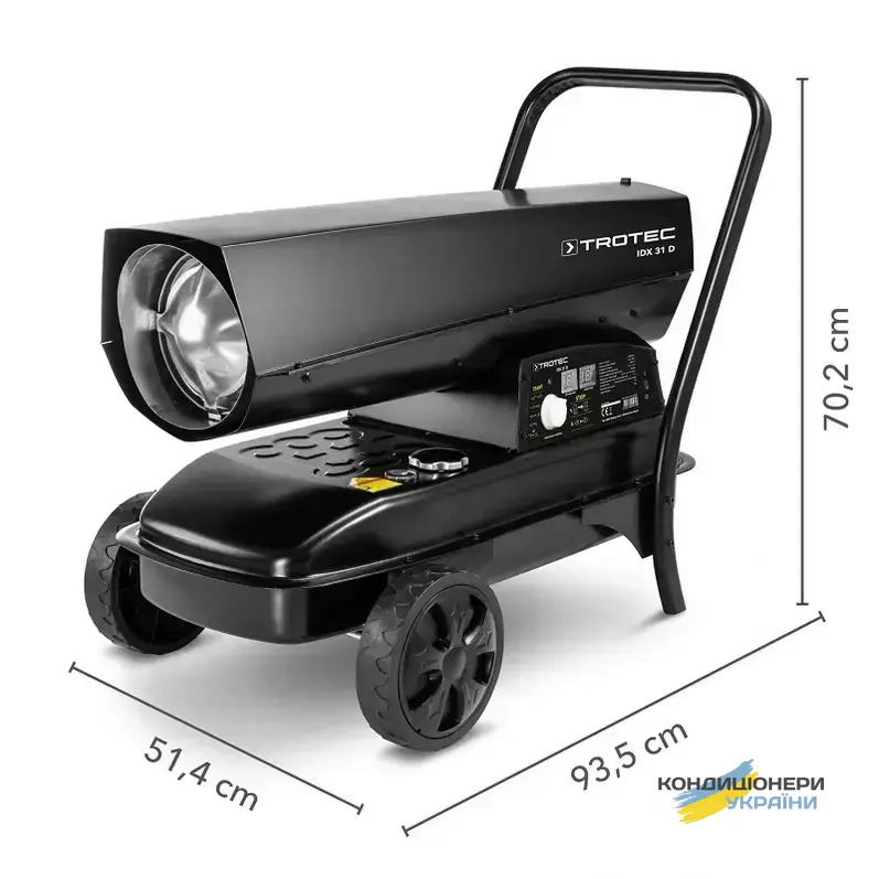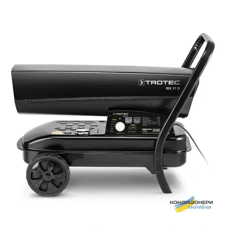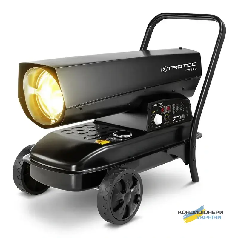 Теплова гармата Trotec IDX 31 D вирішить питання з обігрівом складу, майстерні, виробничого цеху, будівельного майданчика площею від 80 м2. Продумана конструкція обігрівача дозволяє легко переміщати його, завдяки великим колесам і зручній ручці. Вбудований бак гарантує більше 10 годин безперервної роботи, Датчик рівня палива відображає його кількість у баку.